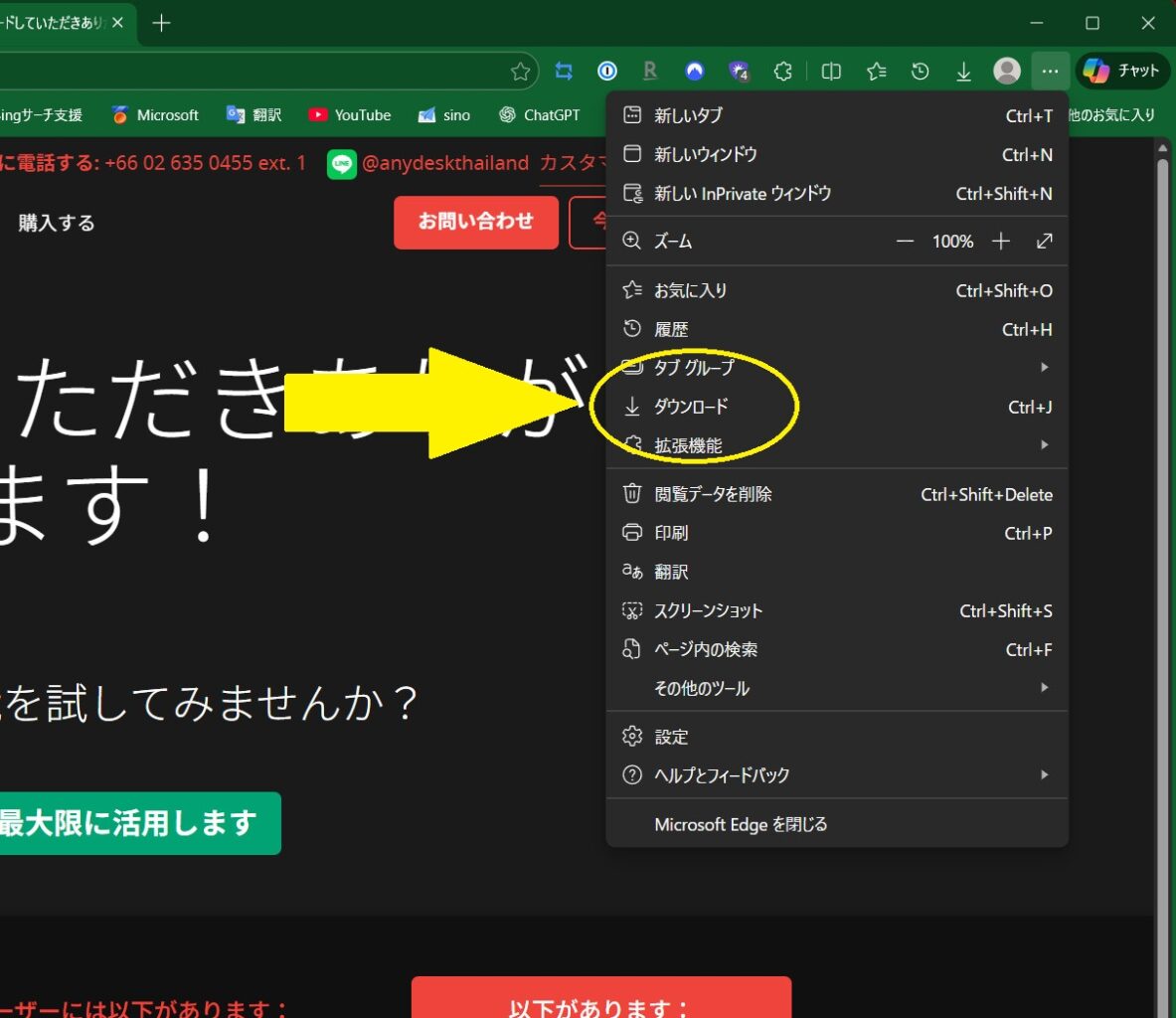 手順3.もし小窓が出ない場合や隠れてしまった場合は右上の3つの点(・・・)をクリックしてダウンロードをクリックすると出てきます。